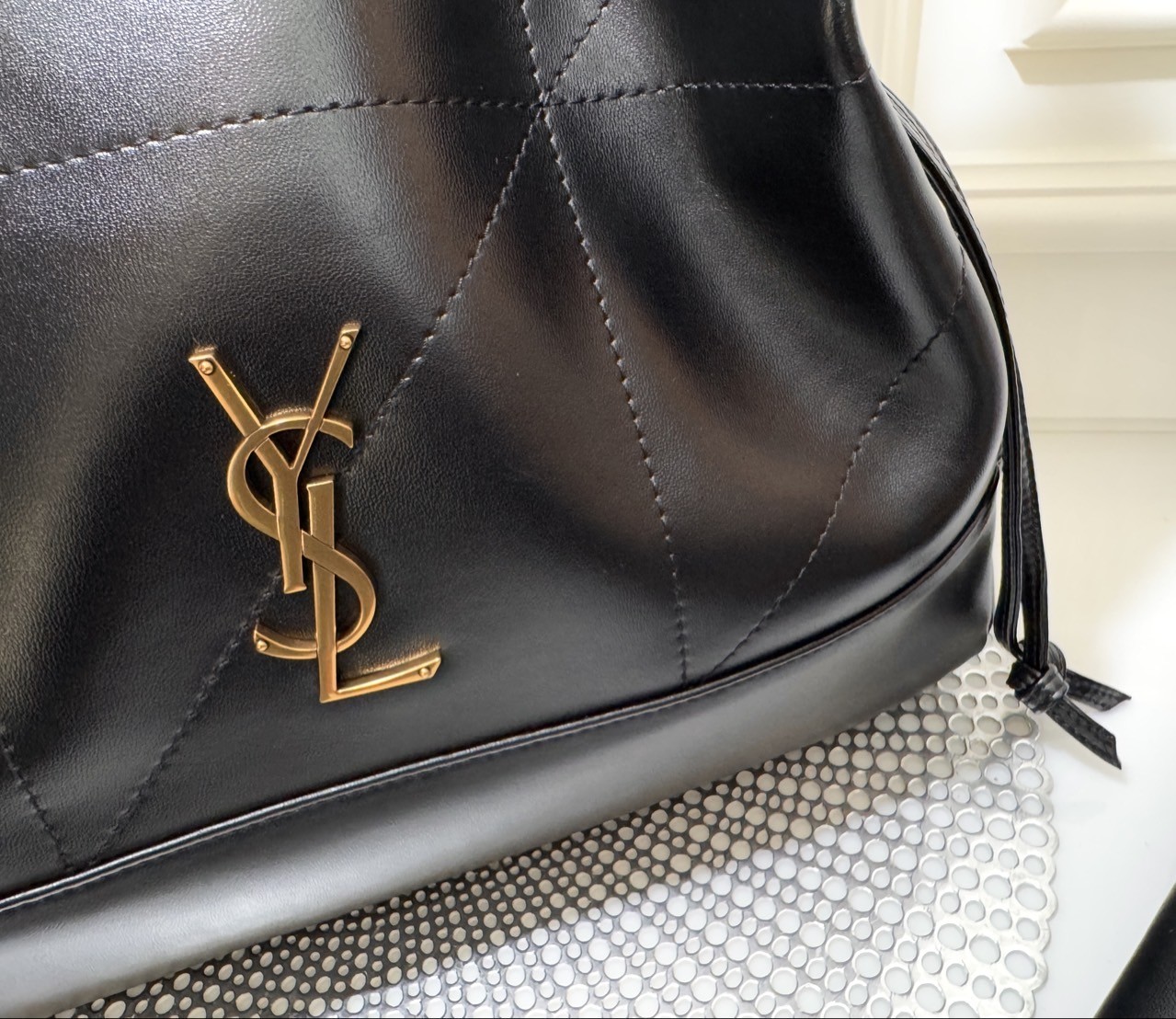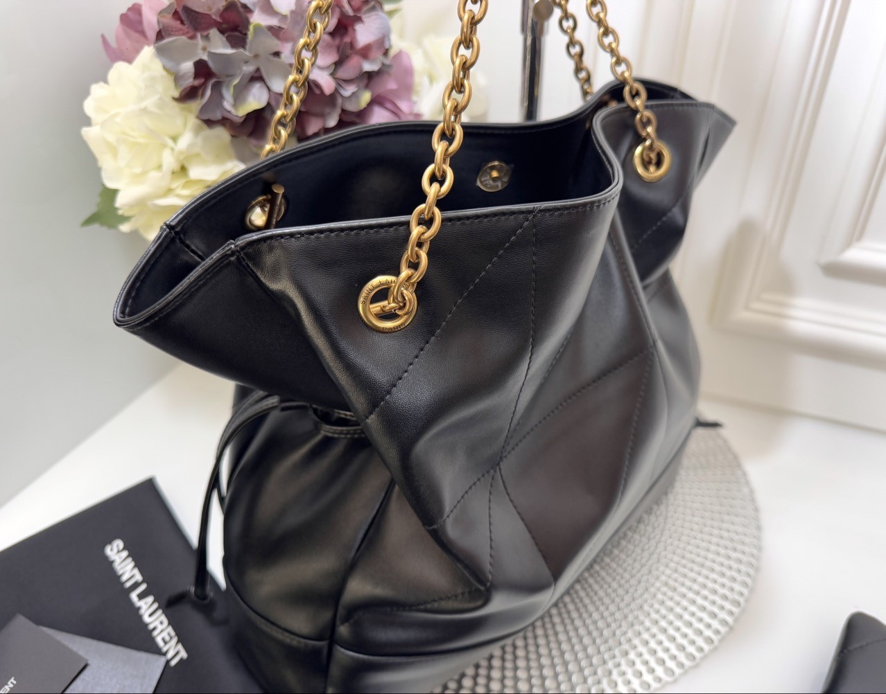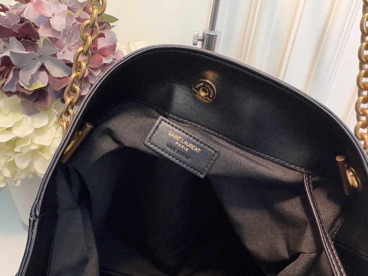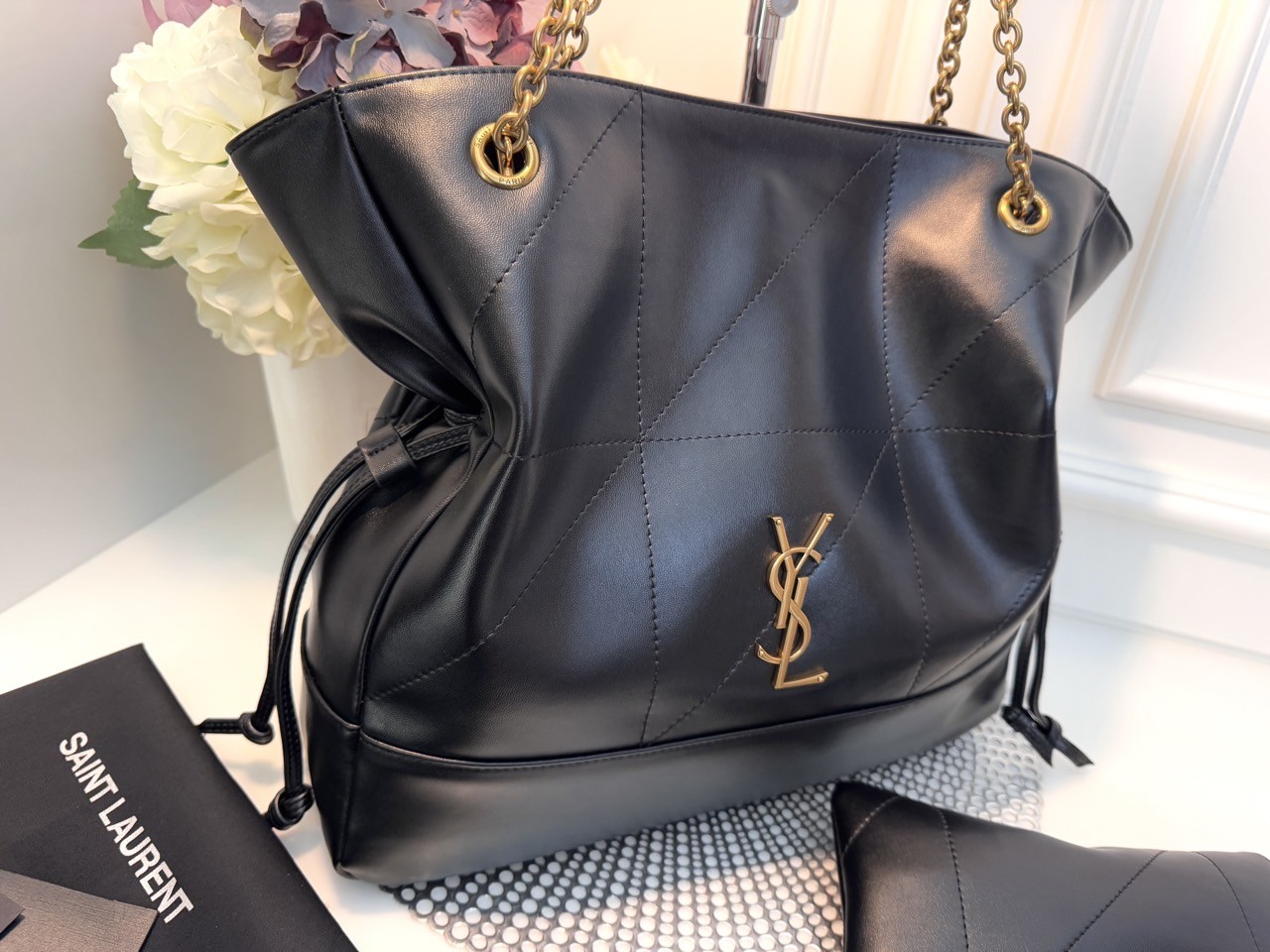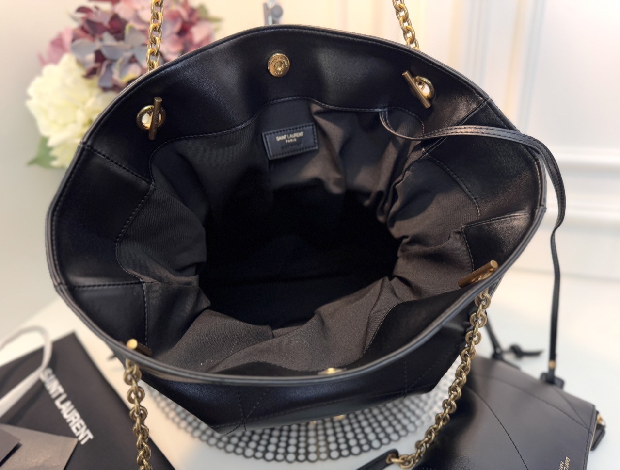 코튼 안감 브론즈 톤 하드웨어 마그네틱 잠금장치 JAMIE 의 토트 버전 부드러운 나파 소재 CASSANDRE 장식 CARRÉ RIVE GAUCHE 탑스티치 장식 체인 스트랩 탈착 가능한 지퍼 파우치