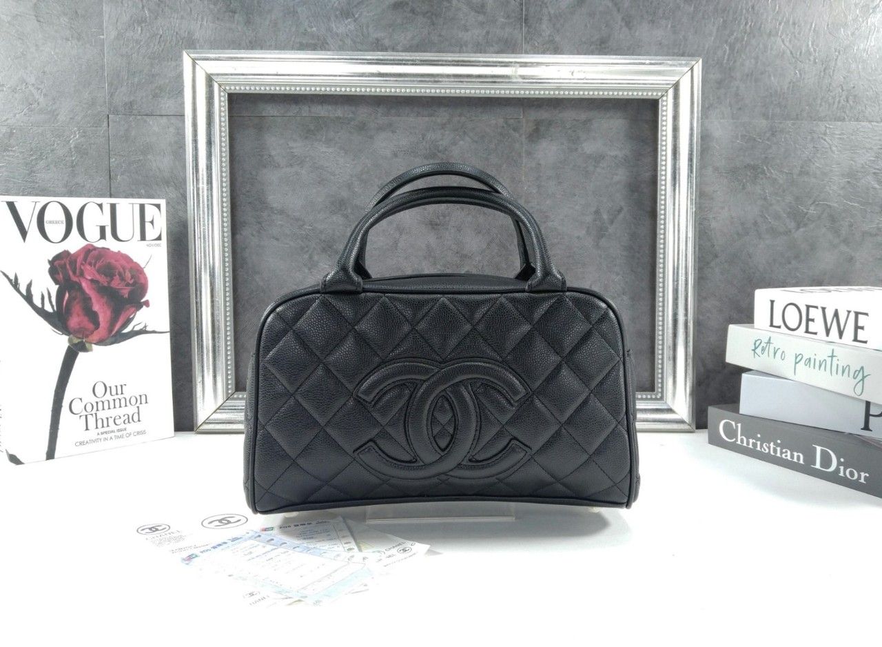샤넬의 시그니처 다이아몬드 퀼팅 디테일의 블랙 캐비어 가 죽으로 샤넬 미니 볼러백입니다.