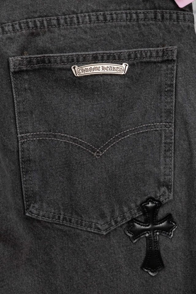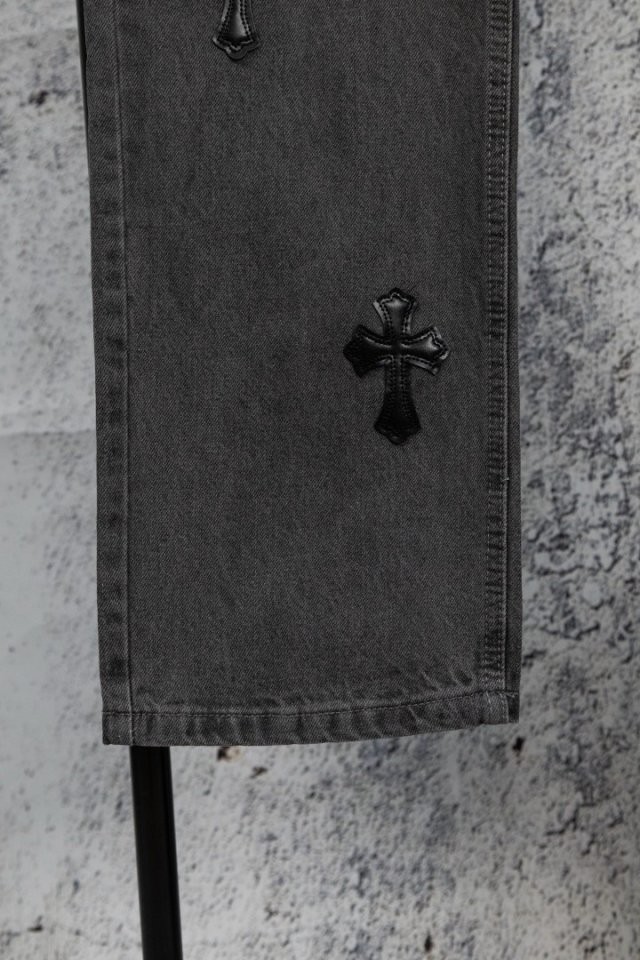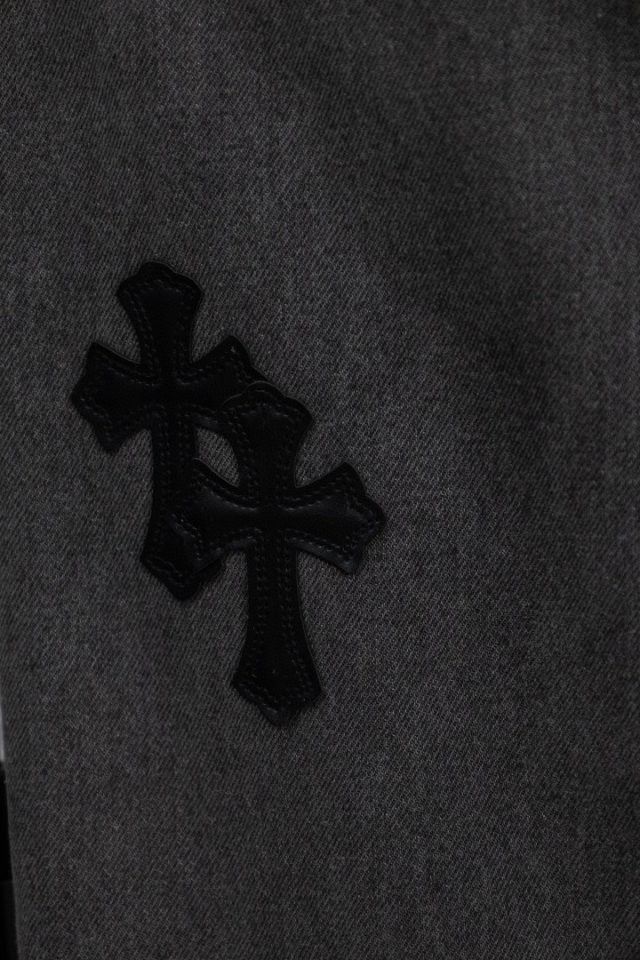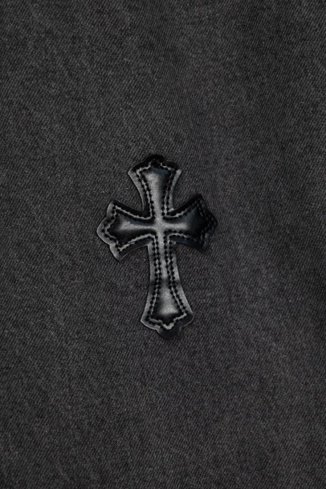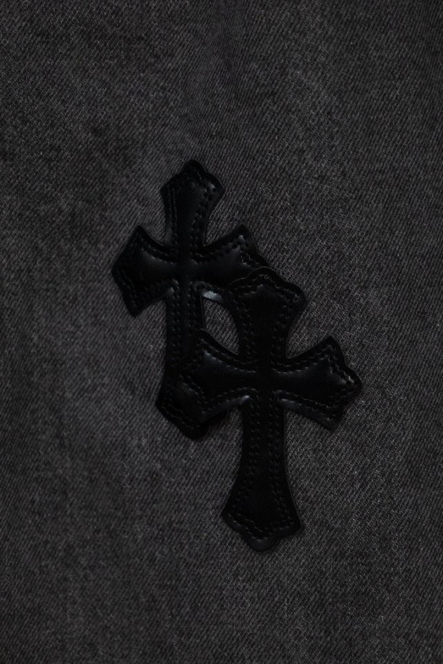 그레이 워싱 데님 위에 블랙 십자 패치 티셔츠 하나만 입어도 느낌이 확실히 살아나는 디자인