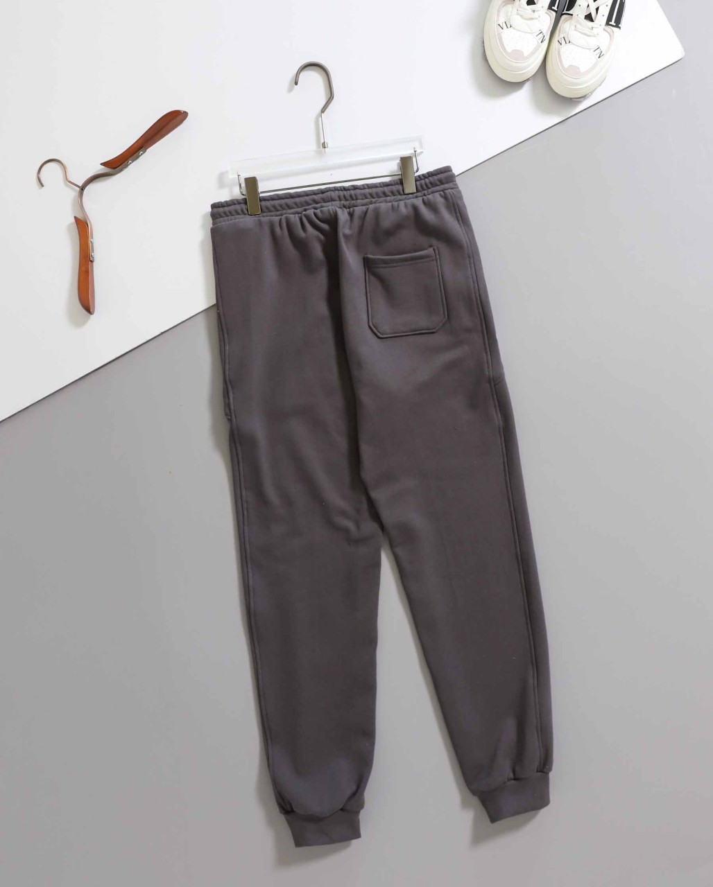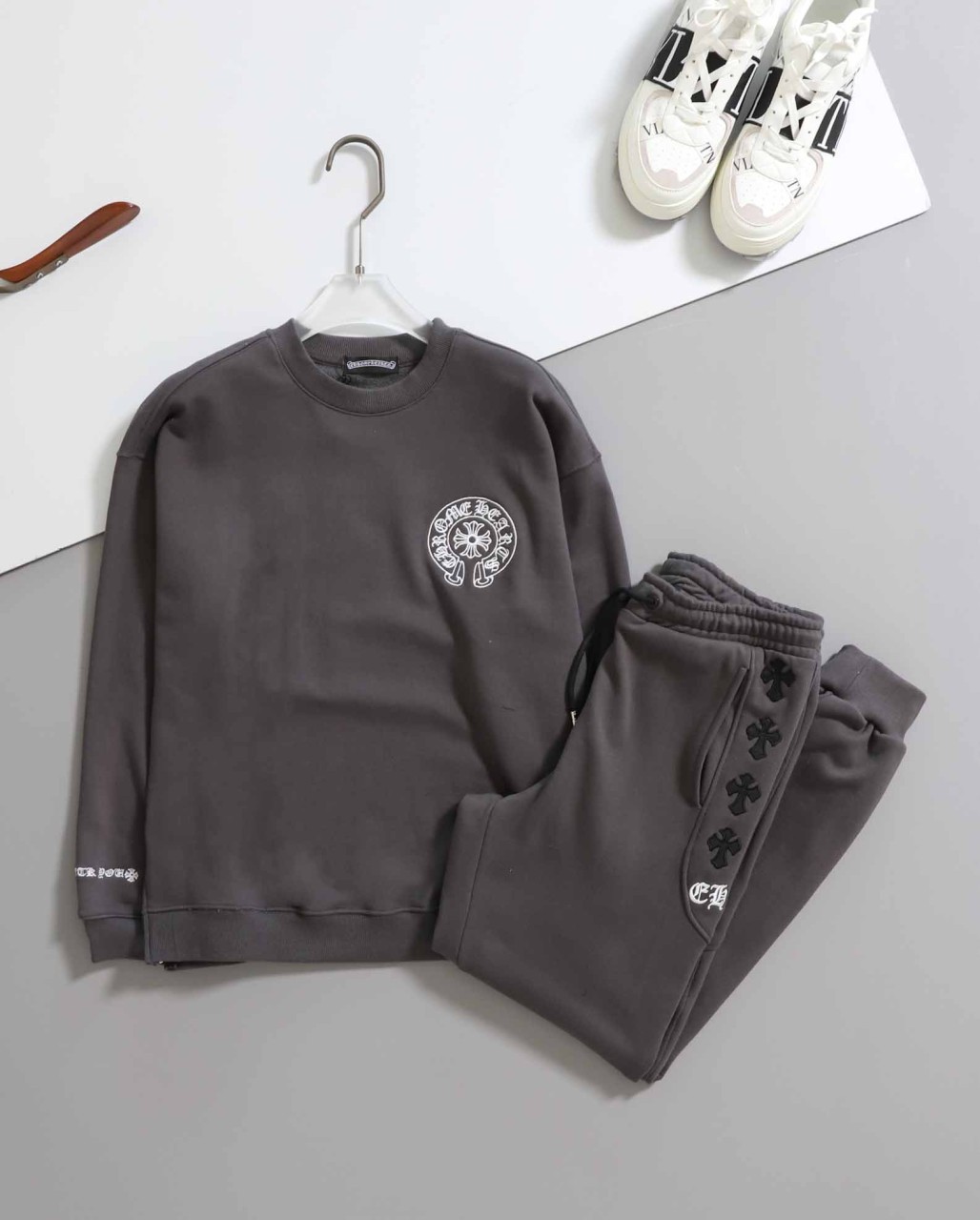 – 그레이 색상의 긴팔 맨투맨과 조거팬츠로 구성된 세트입니다.
